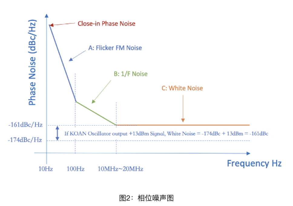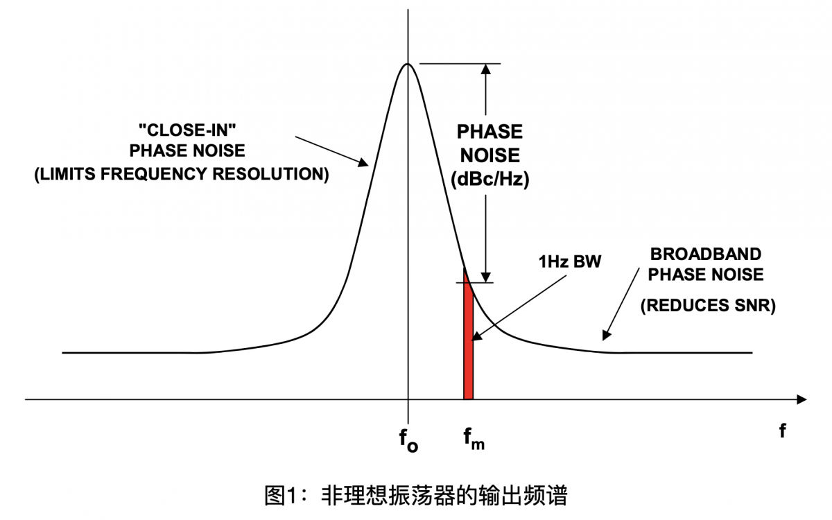 相位噪聲是在指定頻率偏移fm處1Hz寬帶內(nèi)的單邊信號功率和信號總功率的比值,單位是dBc/Hz(分貝與1Hz帶寬載波功率的比值)。相位噪聲的表示為dBc/Hz@fm。x軸表示相對于標(biāo)稱信號或“載波”頻率的頻率偏移。