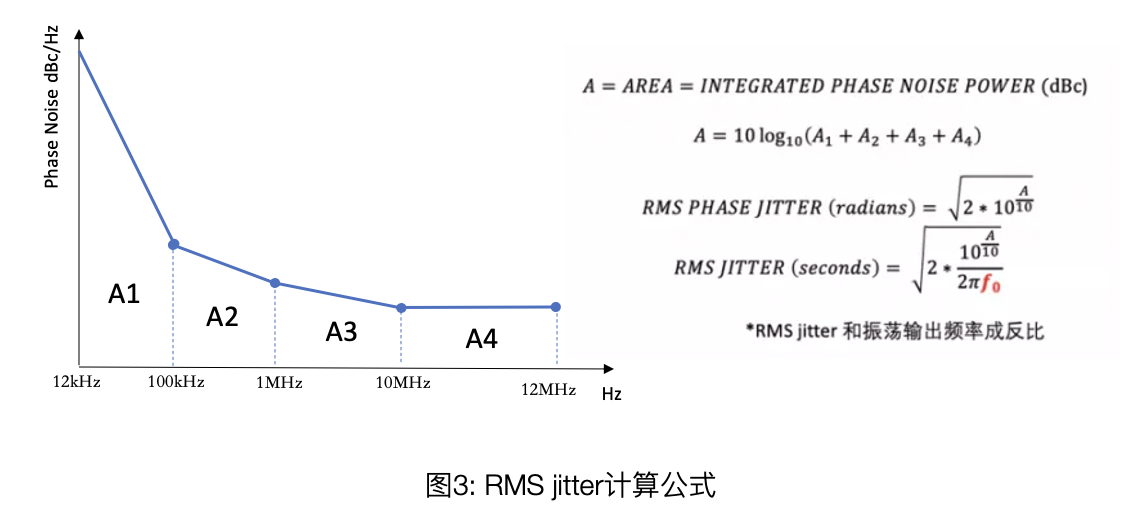 相位抖動是在特定頻率范圍內(nèi)對相位噪聲圖的弧面面積進(jìn)行積分計算。圖2的曲線分為A1、A2、A3、A4區(qū),如圖3。根據(jù)圖3的公式計算出RMS Jitter,值與振蕩輸出頻率成反比。