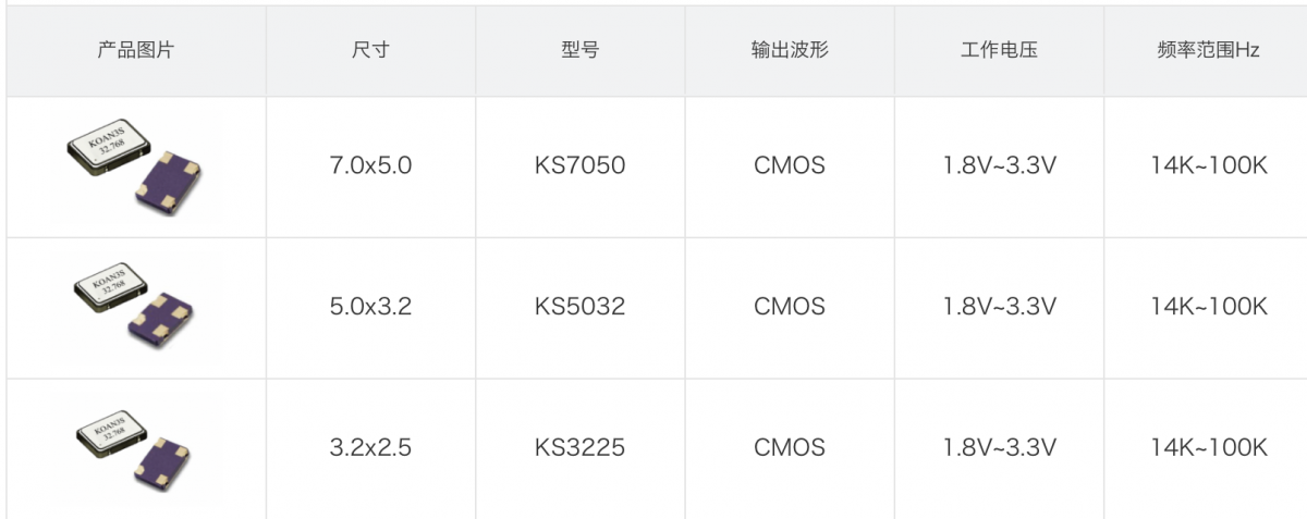 低電壓時(shí)鐘振蕩器1.2V, 頻率范圍為0.25MHz~60MHz,KOAN型號(hào):KS7050, KS5032, KS3225。