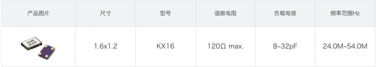 小型化的貼片晶體KX16,頻率范圍是24MHz~54MHz,負(fù)載電容可選8~32pF;
