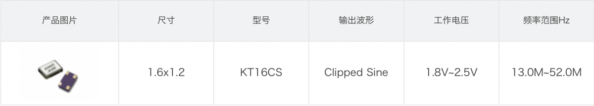 溫補(bǔ)晶振KT16CS,削峰正弦波輸出,頻率范圍是13MHz ~ 52MHz,可選擇1.8V~2.5V工作電壓。