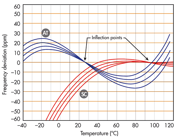 不同晶體的切割方式有著不同的頻率溫度特性:音叉Tuning Fork晶振的溫度特性曲線是負二次方程曲線