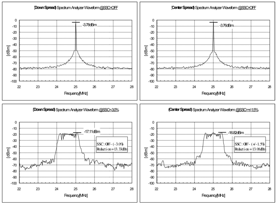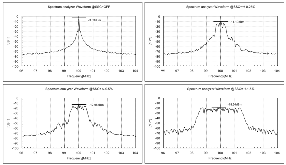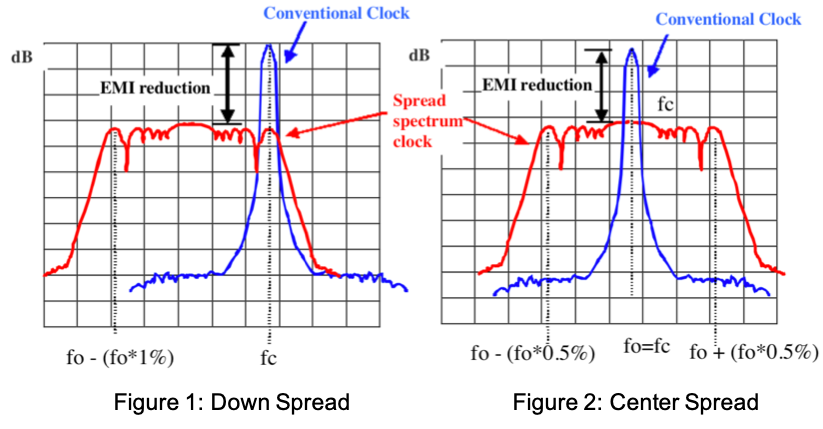 調(diào)制過程可以在標(biāo)稱頻率的一側(cè)(向下擴(kuò)展 Down Spread),或 50% 向上和 50% 下降(中心擴(kuò)展 Center Spread)。以100 MHz SSC為例,其中心頻率在99.500 MHz和100.500 MHz之間調(diào)制,中心調(diào)制百分比為0.5%;如果向下擴(kuò)展為0.5%, 頻率范圍在99.500 MHz 和 100.0 MHz 之間。向下擴(kuò)展 0.5% 等同于中心擴(kuò)展0.25%。 99.500 ~ 100.0MHz (向下擴(kuò)展0.5%) 等于 中心頻率99.750MHz (中心擴(kuò)展0.25%)。