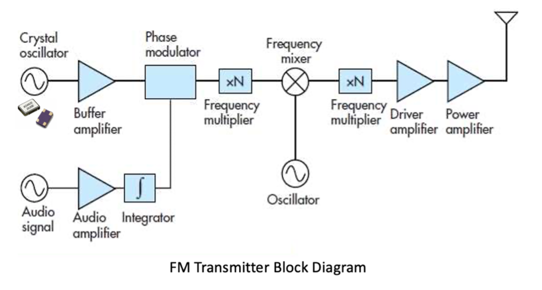 發(fā)射機(jī)(Transmitter): 發(fā)射機(jī)的主要作用是產(chǎn)生載波,將語音或者圖像(Audio Signal)等信號進(jìn)行放大(Amplifier)。經(jīng)過調(diào)制,濾波,放大等步驟后由發(fā)射天線發(fā)送。