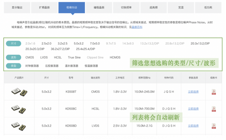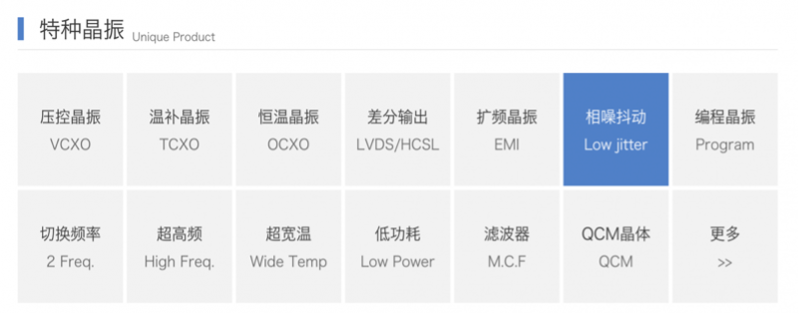 在官網(wǎng)首頁中選‘相噪抖動(dòng)’特種晶振類別。