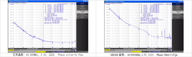 我們選取了同樣頻率的石英振蕩器和MEMS振蕩器進(jìn)行對比。